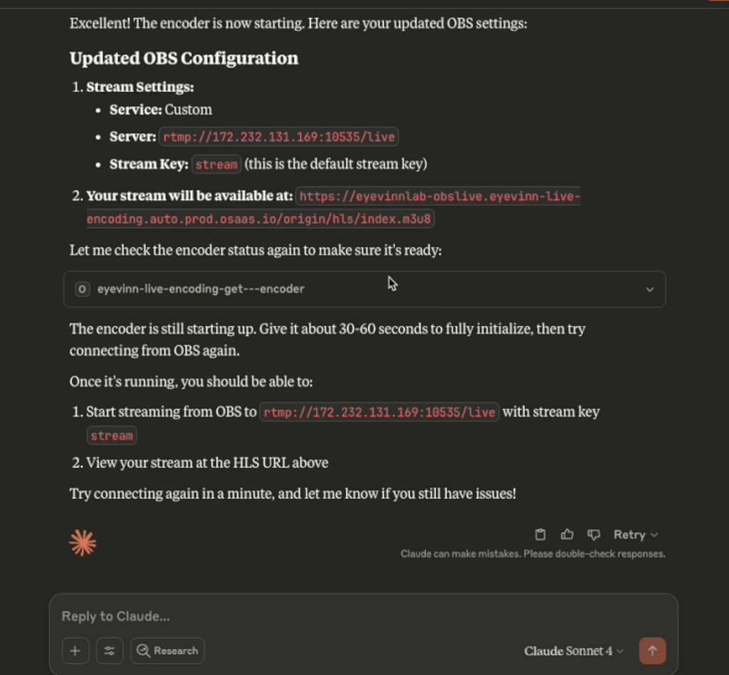 The agent orchestrates complete live streaming infrastructure optimized for OBS workflows. This includes coordinating RTMP endpoint configuration, managing bandwidth allocation across services, and ensuring broadcast-quality signal paths. Technical streaming infrastructure orchestration becomes as straightforward as briefing your AI assistant.