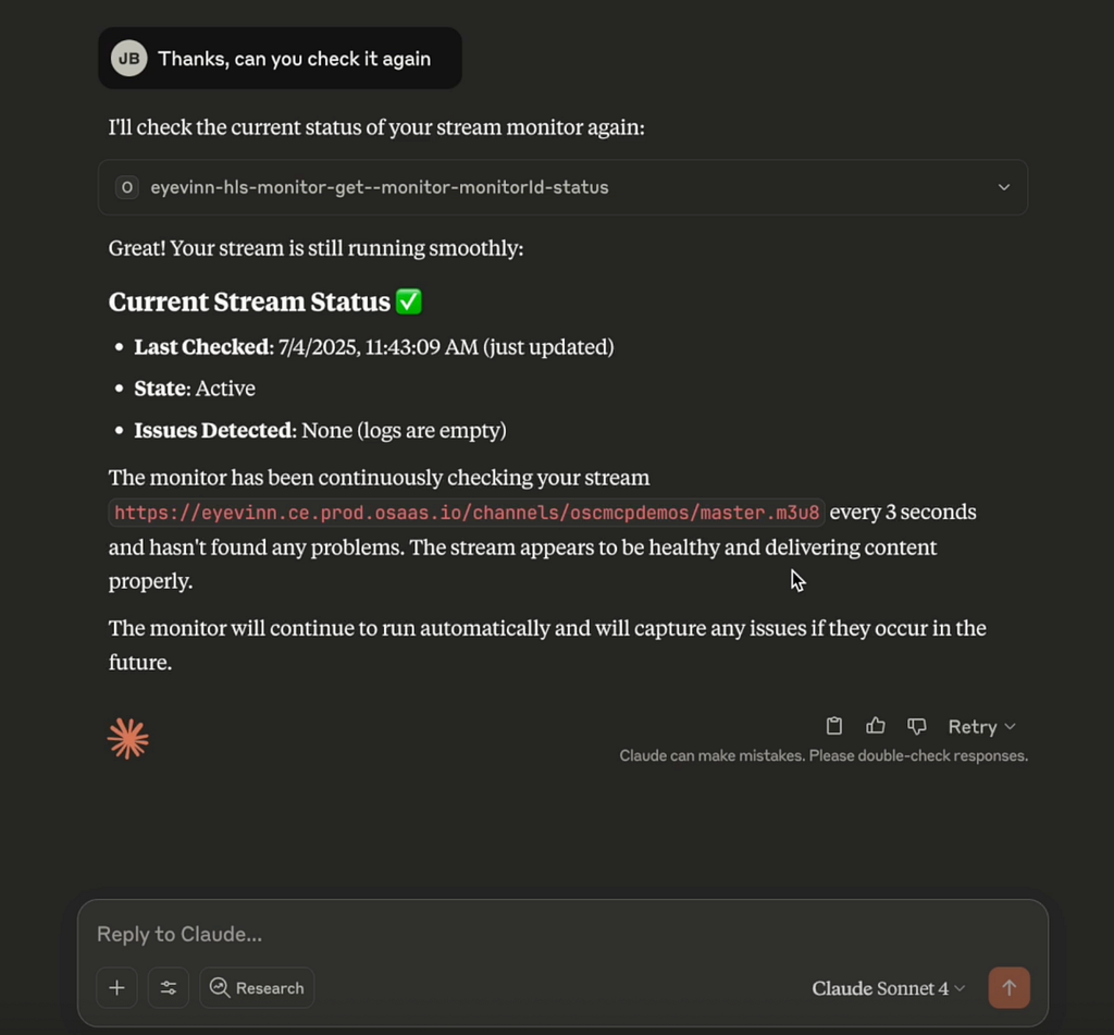 Broadcast quality assurance becomes an orchestrated process through the agent’s ability to coordinate HLS stream monitoring in real-time. It orchestrates continuity checks, detects encoding errors, analyzes bitrate consistency, and coordinates response workflows when signal issues are identified before they impact viewers. This orchestrated monitoring maintains broadcast standards without dedicated operator oversight.